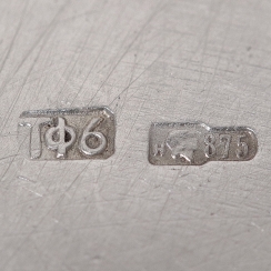 The triple Soviet hallmark in the form of a shovel – "worker's head" with letter "н" and number 875, where: "worker's head" – the national hallmark; "н" - code of the Tallinn Assaying Office; "875" - the fineness mark.