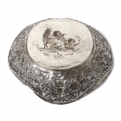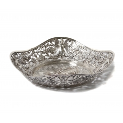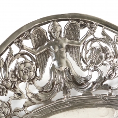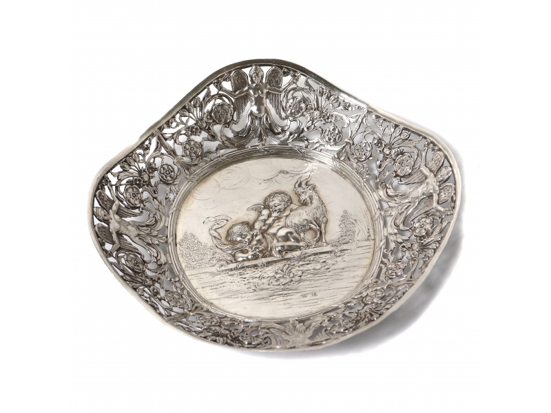 Длина: 25 см, ширина: 24,5 см, максимальная высота: 5,5 см. Вес: 353 грамма серебра 800 пробы. ========================= Silver open-work bowl. The edge of the piece features an openwork floral pattern featuring garlands, flowers, and acanthus leaves. The center features a relief scene depicting frisking putti (cupids) and a goat.