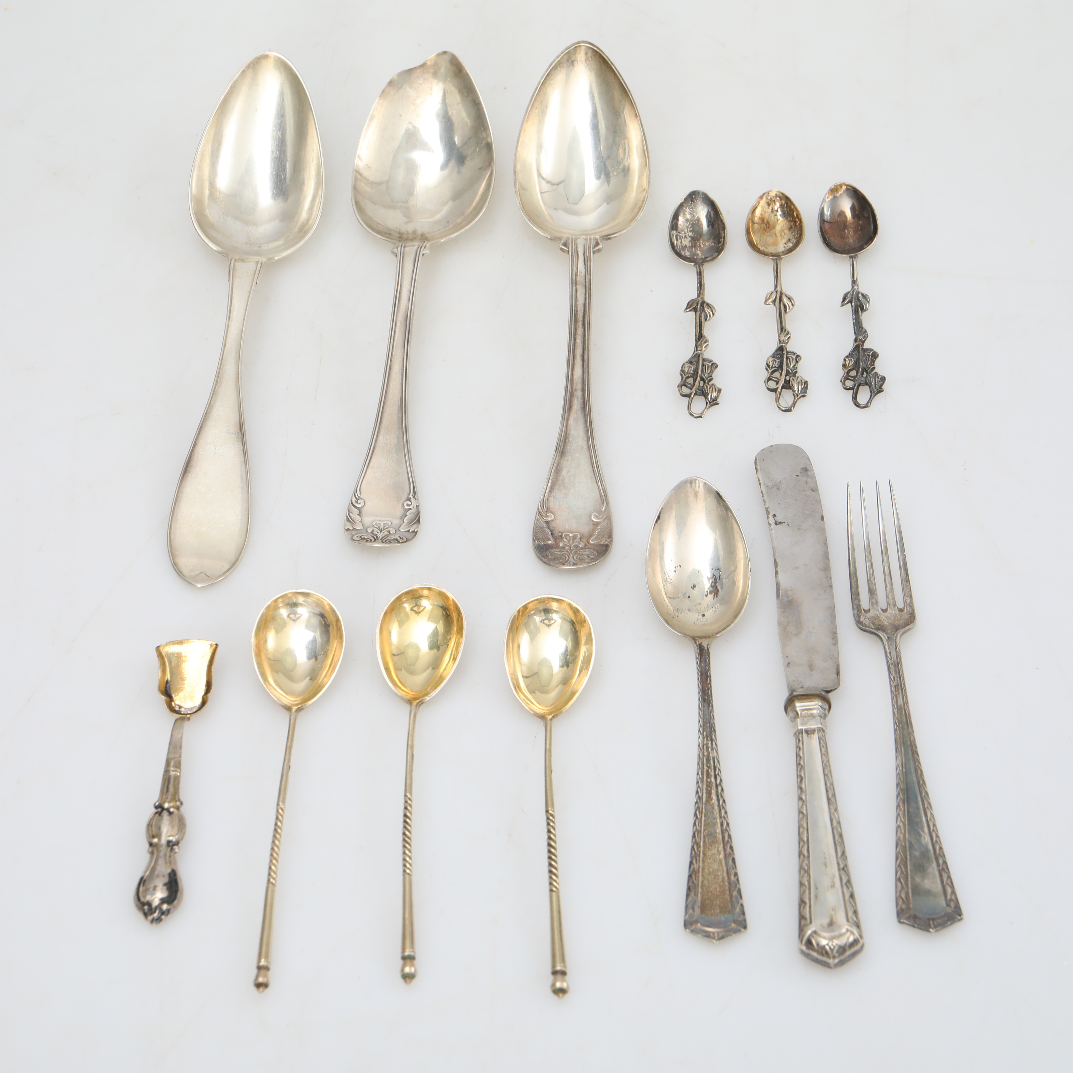 Total weight of solid silver items: 52 grams of silver 830 fineness. Total weight of the knife with silver handle and steel blade: 36 grams.