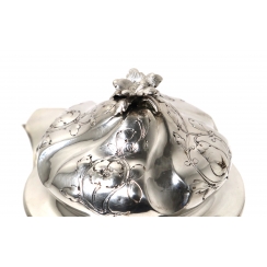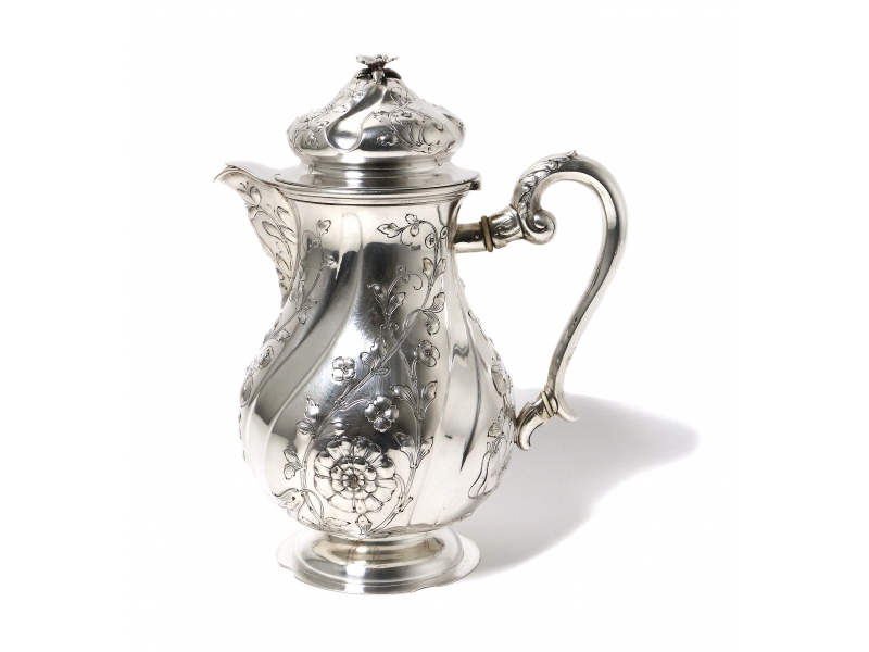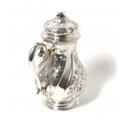 Серебряный кофейник или кувшин с крышкой, декорированный растительным узором.