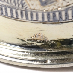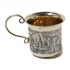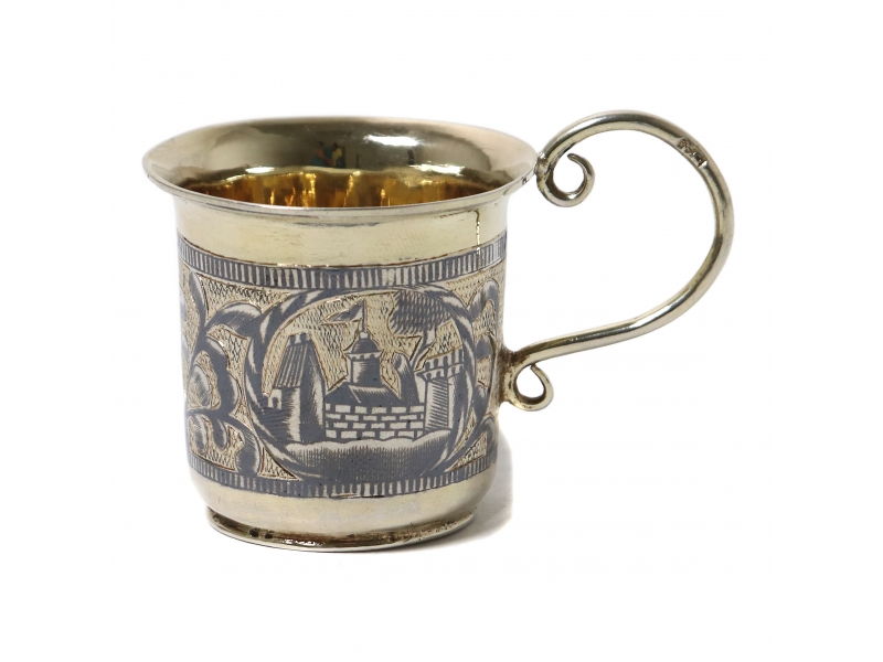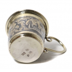 Пробирные российские клейма 19 века, где: "НД" - инициалы пробирного мастера Николая Дубровина (годы работы: 1822-1855); цифра "1832" указывает год клеймения; цифра "84" удостоверяет, что изделие выполнено из серебра 84 золотниковой пробы; "Георгий Победоносец" - клеймо города Москвы. =========================== Silver punch cup with side handle, decorated with niello, gilding.