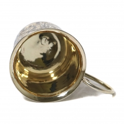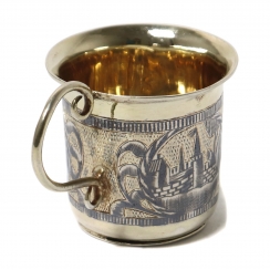 Height at the edge: 4.8 cm, diameter of the top: 5 cm. Volume: 50 ml. Weight: 55 grams of silver 84 fineness in zolotniki ( = 875 metrical fineness).