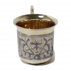 Серебряная чарка с боковой ручкой, декорированная черневым рисунком, позолота.