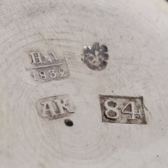 The Russian hallmarks 19th century, where: "НД" - the initials of the assay master Nikolay Dubrovin (worked since 1822 to 1855); "1832" - year of assay; "84" – the fineness mark (84 zolotniks = 875); "St. George" – the Moscow city mark.