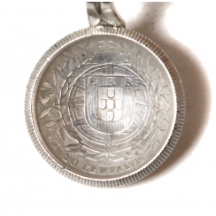 Серебряная сувенирная ложка "Остров Мадейра" с гербом Португалии на конце ручки и черпаком из серебряной монеты номиналом 20 сентаво "Португальская Республика 1913".