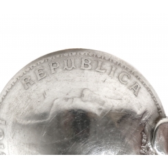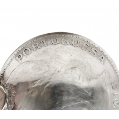 Длина: 9,5 см. Вес: 12 граммов серебра 833 пробы. ========================== Silver souvenir spoon "Madeira" with the coat of arms of Portugal at the end of the handle and scoop from a silver coin of 20 centavos "Portuguesa Republica 1913".