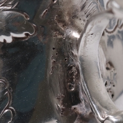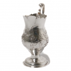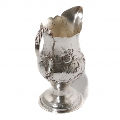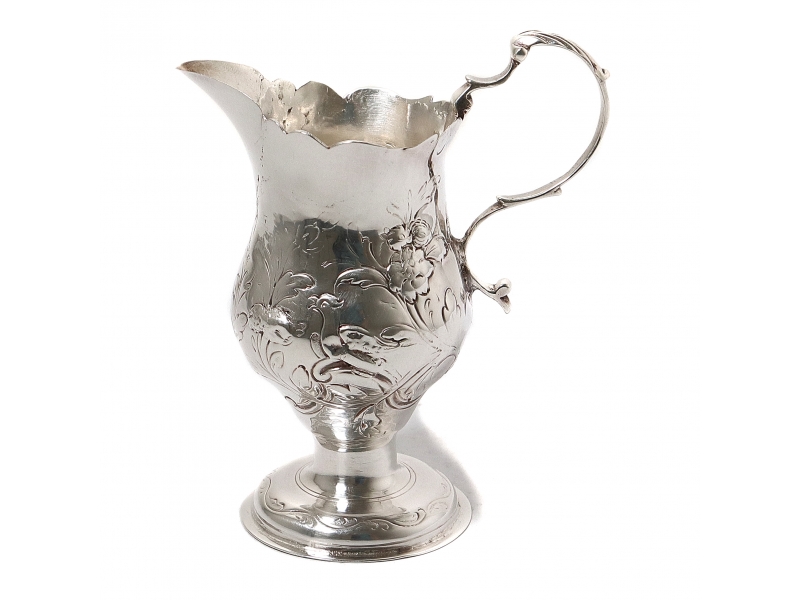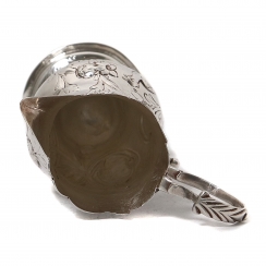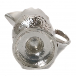 Серебряный молочник, декорированный рельефным изображением цветов и птицы.