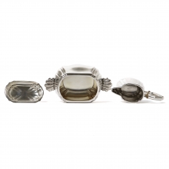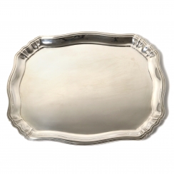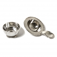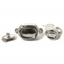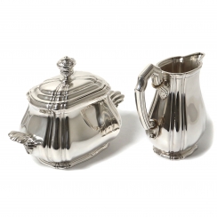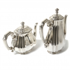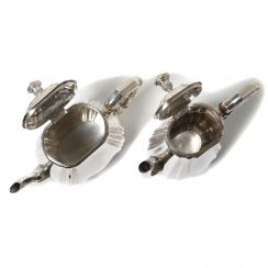Серебряный чайно-кофейный сервиз, 6 предметов: чайник, кофейник, сахарница, молочник и ситечко с подставкой на подносе.