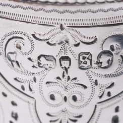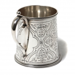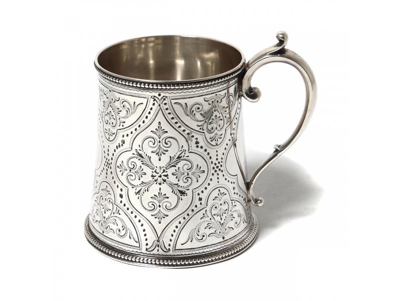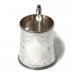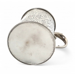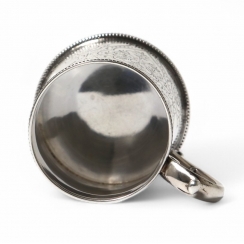 Высота по край: 7,5 см, диаметр верха: 5,8 см. Объём: 170 мл. Вес: 118 граммов серебра 925 пробы. =========================== Silver mug (cup), decorated with a plant pattern.