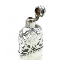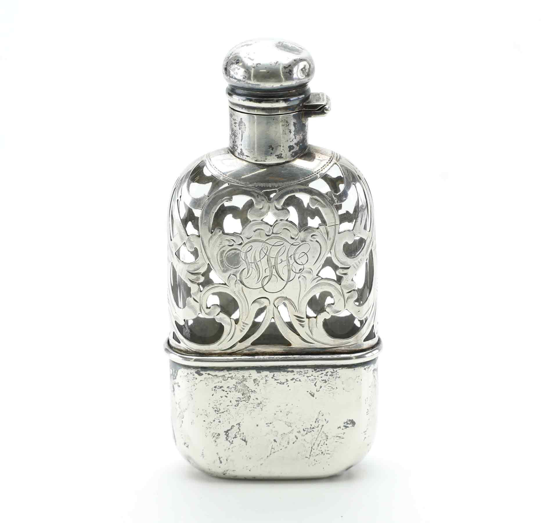 Стеклянная фляжка в обрамлении из серебра 925 пробы. Длина 12,5 см, ширина 6 см, толщина 2,3 см