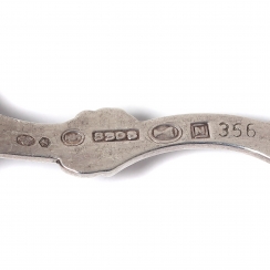Норвегия, г. Тёнсберг, середина 20 века, мастерская Thorvald Marthinsen Solvvarefabrikk (основана в 1883 году). Номер модели: 356. Ввезены в Швецию. Государственное пробирное клеймо Швеции для ввезенных серебряных изделий.
