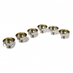 Высота: 4 см, диаметр верха: 6,4 см. Объем: 40 мл. Общий вес: 194 грамма серебра 830 пробы. ================================ Silver punch cups, 6 pcs.