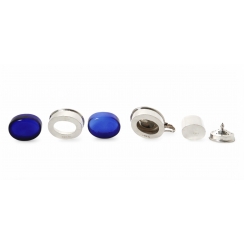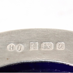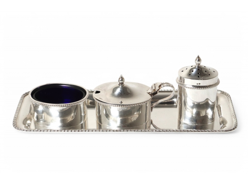 Серебряный набор для специй, 4 предмета: перечница, солонки и горчичница с кобальтовыми вставками на подносе.
