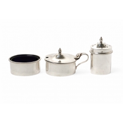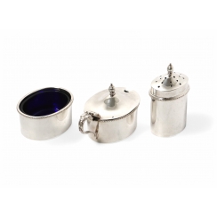 Height of pepper shaker by grip on lid: 6.5 cm, size of base: 3.5 x 2.5 cm. Height of mustard pot by grip on lid: 4.5 cm, size of base: 5.2 x 4 cm. Height of salt cellar: 2.5 cm, size of base: 5.2 x 4 cm Dimensions of tray: 20.3 x 7.5 x 1 cm.