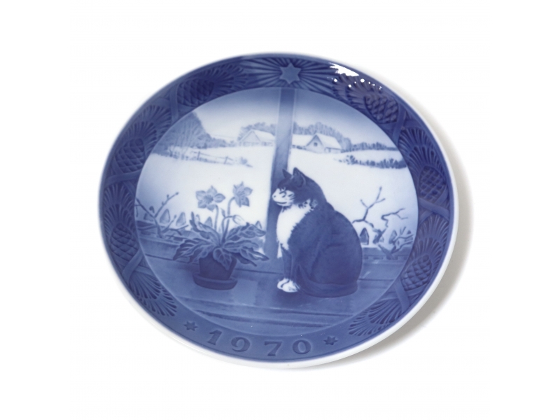 Коллекционная фарфоровая тарелка 1970 года "Кошка на подоконнике с заснеженным пейзажем" (Kat i vindueskarm, i baggrunden snelandskab) из серии годовых рождественских тарелок.
