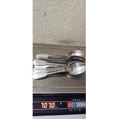 Total weight of solid silver items: 488 grams of silver 830 fineness. Total weight of knives with silver handles and steel blades: 363 grams.
