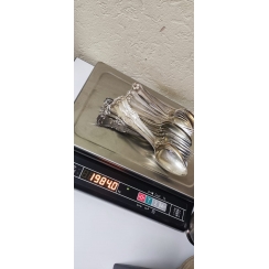 Total weight of solid silver items: 1009 grams of silver 925/830 fineness. Total weight of knives (with silver handle and steel blade): 573 grams.