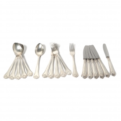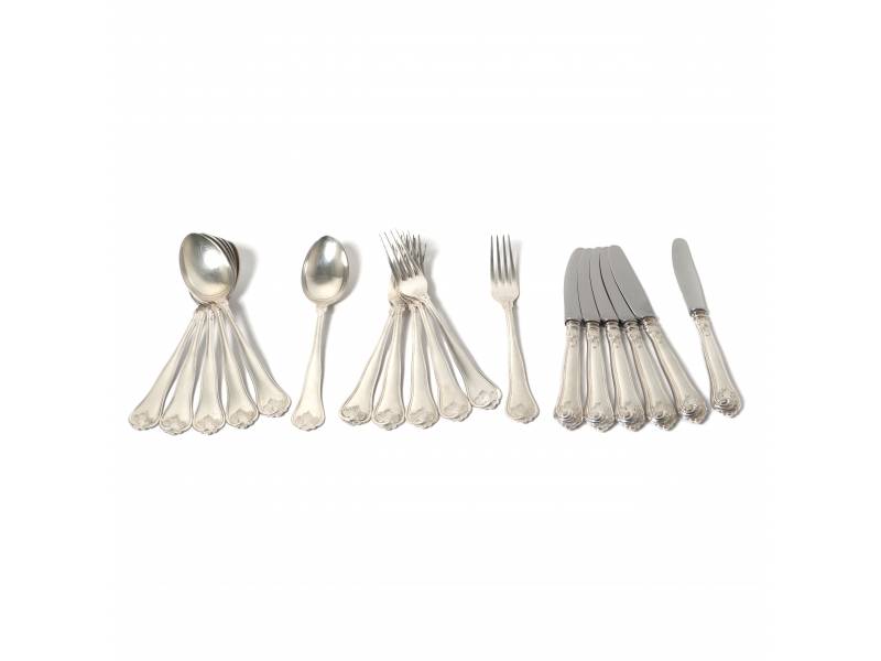Общий вес цельно серебряных приборов: 1009 граммов серебра 925/830 пробы. Общий вес ножей с серебряными ручками и стальными лезвиями: 573 грамма. ========================================= Silver cutlery set for 6 people, 18 items. Pattern "Prins Albert".