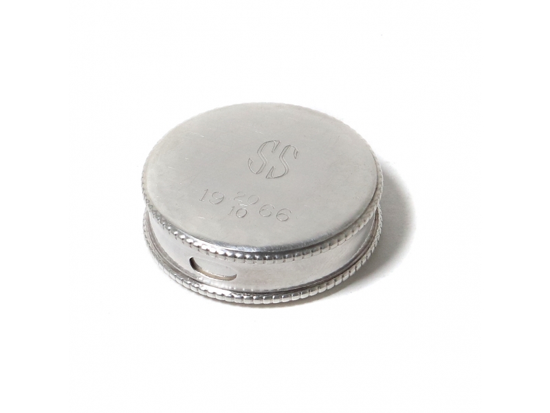 С гравировкой. ========================== Silver pill box for powders, the top cap rotates to reveal an opening located on the side.
