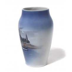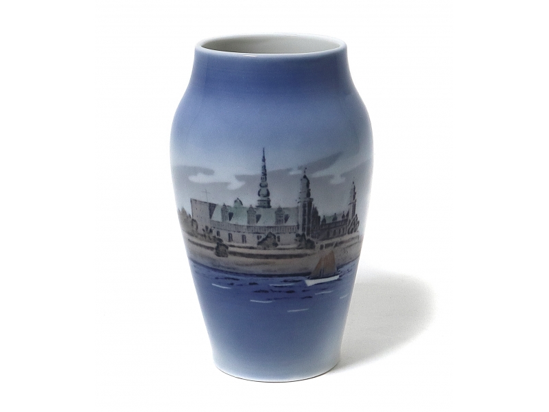 Ваза первого сорта. Без сколов, повреждений и без реставраций. =================================== Porcelain vase, decorated with a landscape overlooking Kronborg Castle. Hand-painted underglaze.