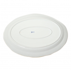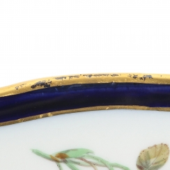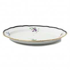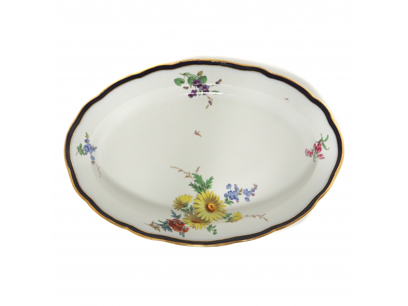 Фарфоровое блюдо. Украшено росписью в виде полевых цветов, бортик с золотым ободком, идущим по кобальтовому краю. Дизайн "Мейсенский букет". Ручная роспись, роспись золотом по кобальтовой глазури.