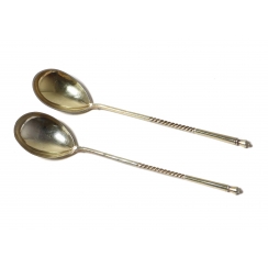 Двузначное российское пробирное клеймо 1880-х - 1899 гг. - "Георгий Победоносец с цифрой 84", где: "Георгий Победоносец" - клеймо города Москвы; цифра "84" удостоверяет, что изделие выполнено из серебра 84 пробы. ============================= Silver teaspoons, 2 pieces, gilding.