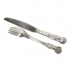 Общий вес цельносеребряных вилок: 410 граммов серебра 925 пробы. Общий вес ножей с серебряными ручками и стальными лезвиями: 325 граммов.