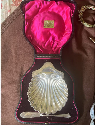 Ваза - икорница и нож-лопатка в оригинальном футляре, Англия, общий вес изделий 89 гр, 925 пр максимальная длина вазы 13,3 см, ширина 10,4 см, высота 2,5 см длина ножа 13,5 см размеры футляра: максимальная ширина 17 см, длина длина 18 см, высота 4,5 см (пятна, потертости, надрывы)