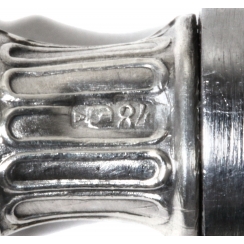 Длина: 19,5 см. Общий вес ножей с серебряной ручкой и стальным лезвием: 51 грамм, серебро 84 золотниковой пробы ( = 875 метрической пробе).