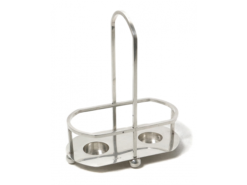 Двузначное пробирное клеймо Латвии 1922-1940 гг. - "профиль женской головы вверх с цифрой 875" в овале, усеченном с двух сторон, где: "профиль женской головы вверх" - знак удостоверения, подтверждает, что изделие произведено в Латвии из драгметалла, проба которого не ниже минимального стандарта, принятого в стране; цифра "875" удостоверяет, что изделие выполнено из серебра 875 пробы. ================================ Oil and Vinegar silver holder.