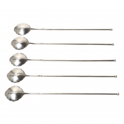 Трехзначное пробирное советское клеймо 1958-1991 гг., где: "серп и молот на фоне пятиконечной звезды" с буквой "э" и цифрой "916", где: "серп и молот на фоне пятиконечной звезды" - знак удостоверения; буква "э" - шифр гос. инспекции пробирного надзора по Эстонской Республике; цифра "916" удостоверяет, что изделие выполнено из серебра 916 пробы. ============================== Silver latte spoons (or bar cocktail spoons), 5 pcs.