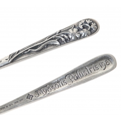 Серебряные кофейные ложки из годовой серии "Полевые цветы Швеции", 2 шт. Производились к фарфоровому сервизу «Veronica Chamaedrys Carl von Linné", фирмы Fyrklövern. На обратной стороне ложки - название цветка "Незабудка болотная" и год 1981.