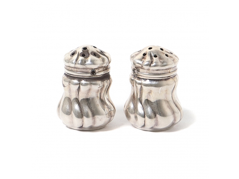 Высота: 3,5 см. Общий вес: 21 грамм серебра 835 пробы. =============================== Silver salt and pepper shaker.