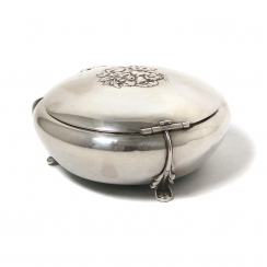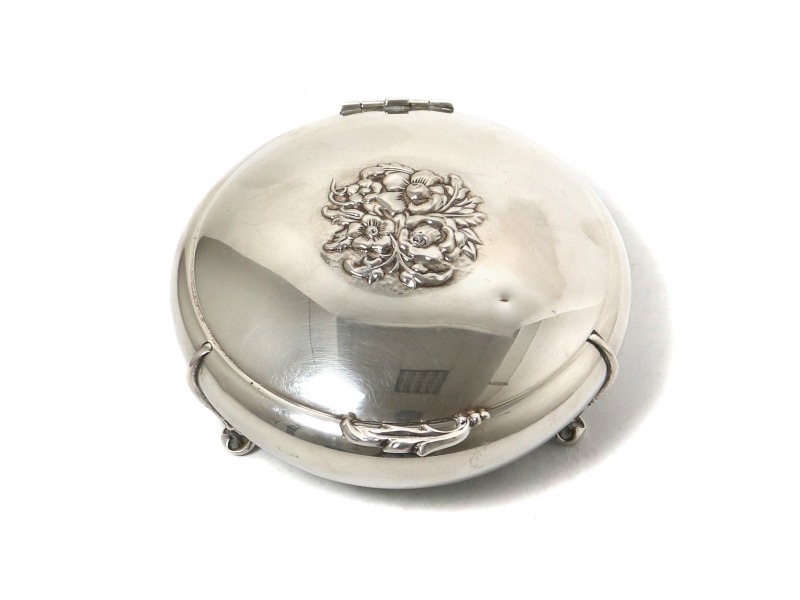 На тулове несколько мелких вмятинок. ========================== Silver trinket box (casket) on legs, decorated with flowers.