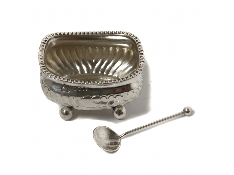 Salt cellar dimensions: length 6.3 cm, width 5 cm, height 4 cm. Spoon length: 6.5 cm.