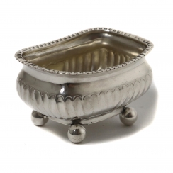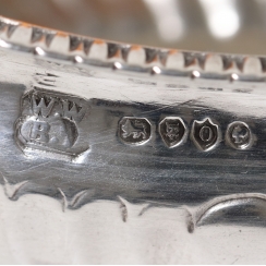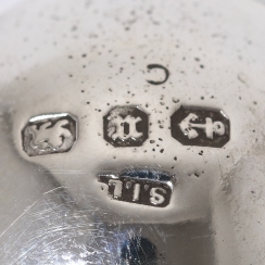 Солонка произведена в Англии, г. Лондон, 1889 год, мастерская Johnson, Walker & Tolhurst Ltd (Walter Walker & Brownfield Tolhurst) (годы работы: 1888-1903).