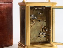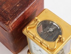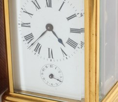 231262 - Каретные часы, высота по верхнюю панель12,4 см, высота по верх поднятой ручки 16,5 см, длина 8,8 см, ширина 7,8 см. Ключ, чехол. |