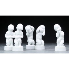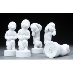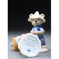 The series of figurines "Victor and Victoria’s family" was produced by Bing & Grondahl factory from 1997 to 2008 and was designed by the American artist Sheilah Beckett. She is well-known for her illustrations to more than 70 classic fairy tales. The series tells us a story of the most interesting life moments of charming teddy bears Victor and Victoria. It starts with the day of their encounter, shows family life, birth of their son Theo and it ends with the birth of their daughter Ursula. Two new figurines were produced every year since 1997 to 2004. Three new figurines were manufactured since 2005 to 2007. There were 4 new figurines produced in 2008 when the new character Ursula appeared.