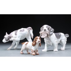 Фигуру продолжали производить также после объединения фабрик Royal Copenhagen и Bing & Grondahl (1985-1989) под брендом Royal Copenhagen, с новым номером модели: 450. =============================== Porcelain figurine "Cocker Spaniel". Hand-painted underglaze.