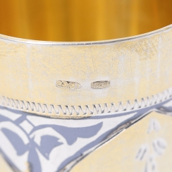 Трехзначное пробирное советско-российское клеймо 1958-1993 гг. - "серп и молот на фоне пятиконечной звезды" с буквой "м" и цифрой "875", где: "серп и молот на фоне пятиконечной звезды" - знак удостоверения; буква "м" - шифр Центральной гос. инспекции пробирного надзора, г. Москва; цифра "875" удостоверяет, что изделие выполнено из серебра 875 пробы. ================================= Silver vodka cup (shot cup), gilding, niello.