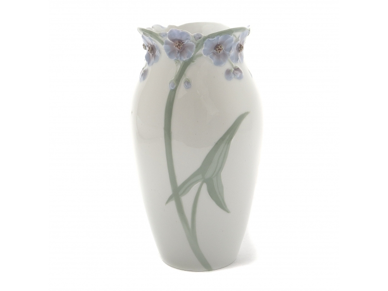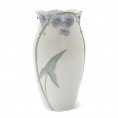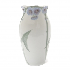Ваза из коллекции Ханса Шмидта (Hans Schmidts), опубликована на стр. 200 в книге Нистром Б. Rörstrand Jugendstil-Porzellan aus Schweden. Art Nouveau Porcelain from Sweden. he White Gold of the Nord. Collection Hans Schmidts [Рорстранд. Фарфор в стиле модерн из Швеции. Белое золото севера. Коллекция Ганса Шмидта]. – Германия, Штутгарт: Издательство Arnoldsche Art Publishers, 2011. – 223 с. - ISBN 378-389790-341-8. ================================= Unique porcelain vase. Modern. With three arrowhead stalks terminating in a wide arc at the vase rim; alternating one and two flowers in relief at the neck of the vessel. Hand-painted underglaze on relief.