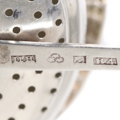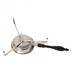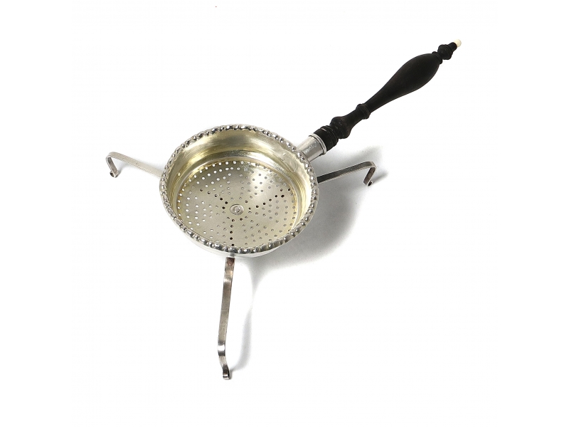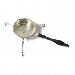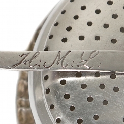С гравировкой. ======================= Silver strainer on legs with a wooden handle.
