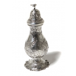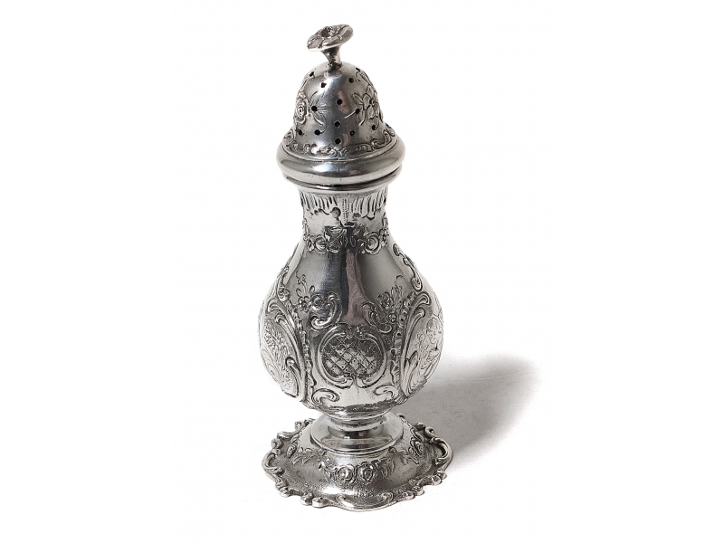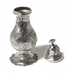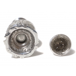 Высота: 13 см. Вес: 102 грамма серебра 830 пробы. =============================== Silver salt shaker, decorated with floral ornaments.