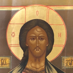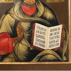 Каноническое изображение Христа Пантократора (Вседержителя), в человеческих чертах выражающее воплощенного Сына Божия, божественное величие Творца и Искупителя, правящего судьбами мира. Христос изображен фронтально, его взгляд направлен прямо на нас. Строгость Его черт смягчается глубокой милостью, напоминая о том, что Господь пришел в этот мир, чтобы взять на Себя наши грехи. Правая рука Христа сложена в двуперстном благословляющем жесте, левой Он придерживает установленное на колено раскрытое Евангелие с традиционным текстом: «Придите ко Мне все труждающиеся и обремененные, и Я успокою вас; возьмите иго Мое на себя и научитесь от Меня, ибо Я кроток» (Мф. 11,28). В верхних углах иконы расположены христограммы, над плечами Христа – надпись: «Образ Господа Вседержителя».