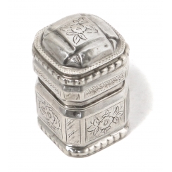 Высота: 5 см, размеры основания: 3 х 3 см. Вес: 23 грамма серебра 833 пробы. ================================ Small silver jar or jewelry box, decorated with floral pattern.
