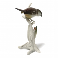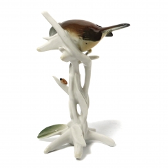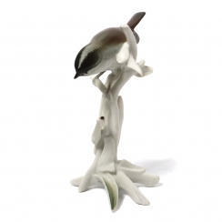 Так как фигура в печи обжигалась лежа на боку, на четырех опорах есть так называемые поинт-марк. Поинт-марк — технологический след опорного штифта, образовавшийся в процессе обжига фарфорового изделия. =========================== Porcelain figurine "Titmouse on a branch with a ladybug". Hand-painted underglaze.