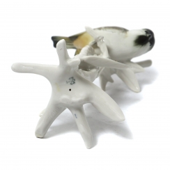 Since the figure was fired in the kiln lying on its side, there are so-called point marks on the four supports. A point mark is a process trace left by a support pin during the firing of a porcelain piece.