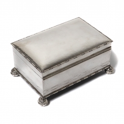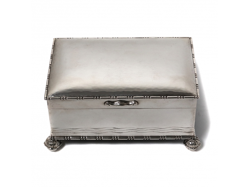 Максимальные размеры: 15,7 х 10,8 х 7,5 см. Общий вес, включая не серебряные части: 747 граммов, серебро 830 пробы. ==================================== Silver box (casket) with wooden bottom and interior wooden trim.
