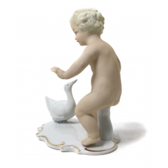 Фарфоровая фигура (статуэтка) "Обнаженный мальчик (путти) с гусем". Ручная роспись.
