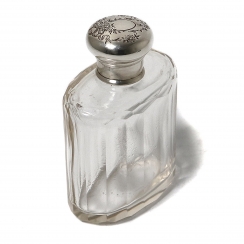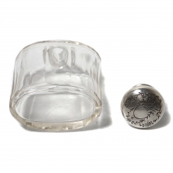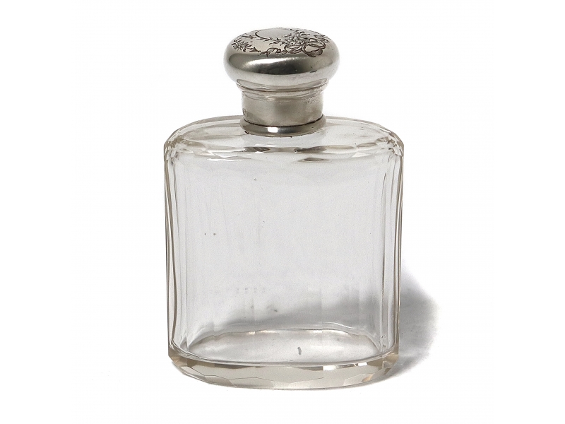 Флакон или фляжка с винтовой крышкой. Крышка декорирована растительным узором. Стекло, серебро 925 пробы.